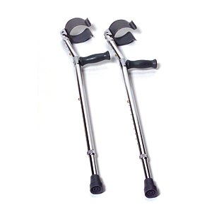 Easy to adjust and provides comfortable support. Comes with padded arm cuffs and locking collars that reduce rattles. Vinyl-coated half-inch aluminum cuffs. Cushioned vinyl handgrips. Extra-large grey tips. Dimensions: patient height:5'-6'2", height adjustment 28-37", top of cuff 9.5-11". Product weight:4lbs8oz, weight capacity:300lbs.